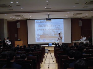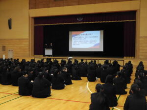 新湊中学校は、昨年度改訂した「ネットルール」の変更点やその変更理由、本校の取組の成果と課題について生徒会の代表が発表しました。