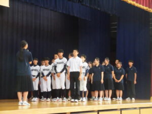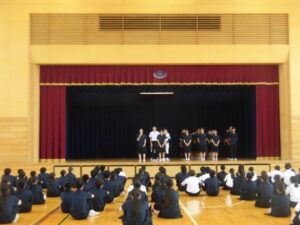 全校集会では、委員会からの報告の後に生徒会主催の交流ゲームが行われました。