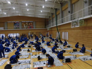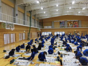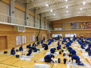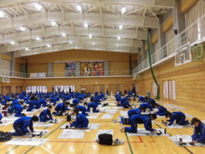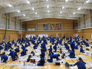 5限には校内書初大会を行いました。全校生徒が体育館に集まり、少し緊張感の漂う空気の中、真剣に筆をとりました。