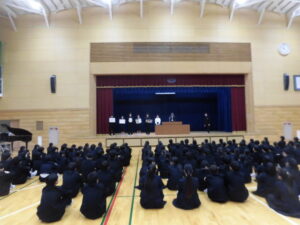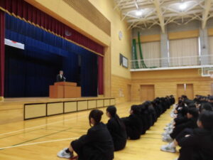 終業式に先立ち、「いみず鳳雛きらめき塾」の報告を行いました。