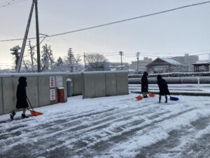 今日は当番の3年生の生徒が生徒玄関前・配膳室前を除雪しました。