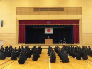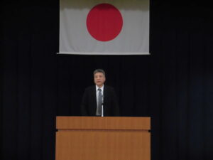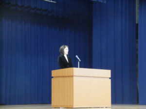「あっと言う間の一年だった。そして、次の一年もあっと言う間の一年になると思う。本年度のキーワード「考える・思いやる・鍛える」の「鍛える」を意識してほしい。「鍛える」とは、「がんばる」、「我慢する」ことである。「がんばる」とは、「将来のためにしたくないことをすること」で、「我慢する」ことは、「将来のために何かをしないこと」であり、その二つが自身の成長につながる。そして、有意義な春休みにしてほしい。」