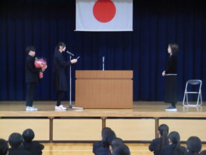 修了式の後には、図書館司書の先生の離任式をしました。代表の生徒がお別れの手紙を読み、花束を贈呈しました。